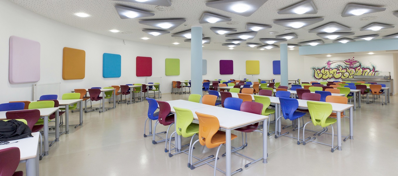 Všude jsou tvrdé povrchy – omítka, beton, sklo, ocel. Kam tedy umístit akusticky pohltivé materiály, aby se toto foyer neobtěžovalo uživatele hlukem? Na strop!