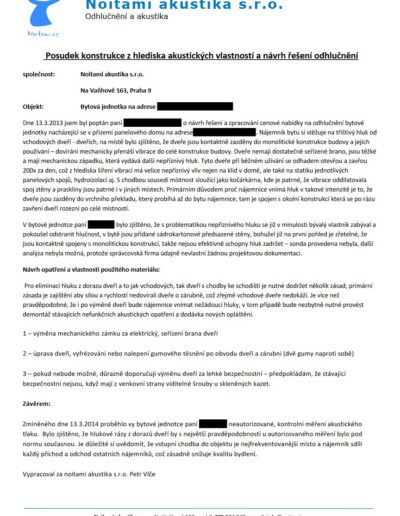 Posoudíme neprůzvučnost v bytech před tím, než je koupíte, popřípadě vyčíslíme náklady spojené s případným odhlučněním. Tyto posudky děláme jak na základě osobních návštěv za použití aparatury, vytvoření sond, prohlížení inspekční kamerou atd., tak dle předaných podkladů jako jsou materiálové skladby, fotografie z rekonstrukcí atd. Ve složitějších případech spolupracujeme s akreditovanými akustiky.
