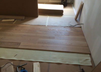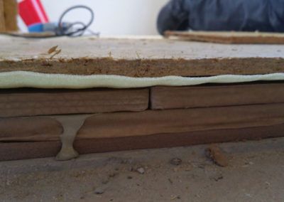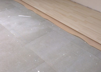 Jednalo se o činžovní dům kolem roku 1920, při obhlídce na místě jsme zjistili, že podlaha sousedů vykazuje absenci těžké složky, která je ve skladbě trámového stropu – podlahy nepostradatelná. Zásyp v minulosti zřejmě někdo vybral a nahradil obyčejnou izolací. Bylo zde jasné, že řešení, pokud se nevrátí zásyp nebude dokonalé. Návrh spočíval v odhlučnění podlahy a v odhlučnění stropu. V místě pronajímaného bytu byla dodána 1x dřevovláknitá deska a 2x deska WOLF TRI 15 mm, tím se částečně vyřešilo jak zatížení plošné hmotnosti podlahy, tak i rozložení rázovitých mechanických nárazů které vznikají při chůzi – především patou.