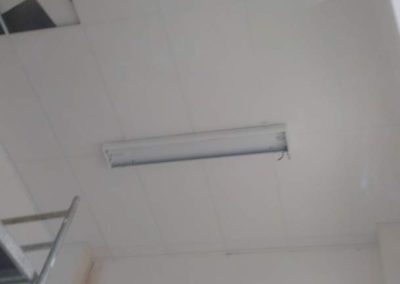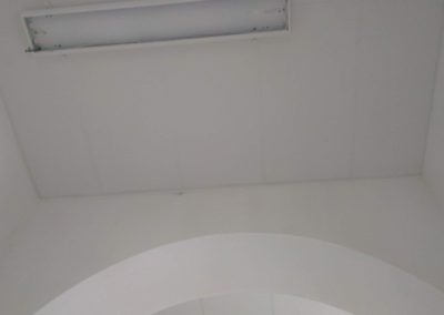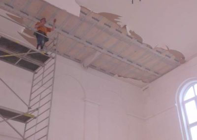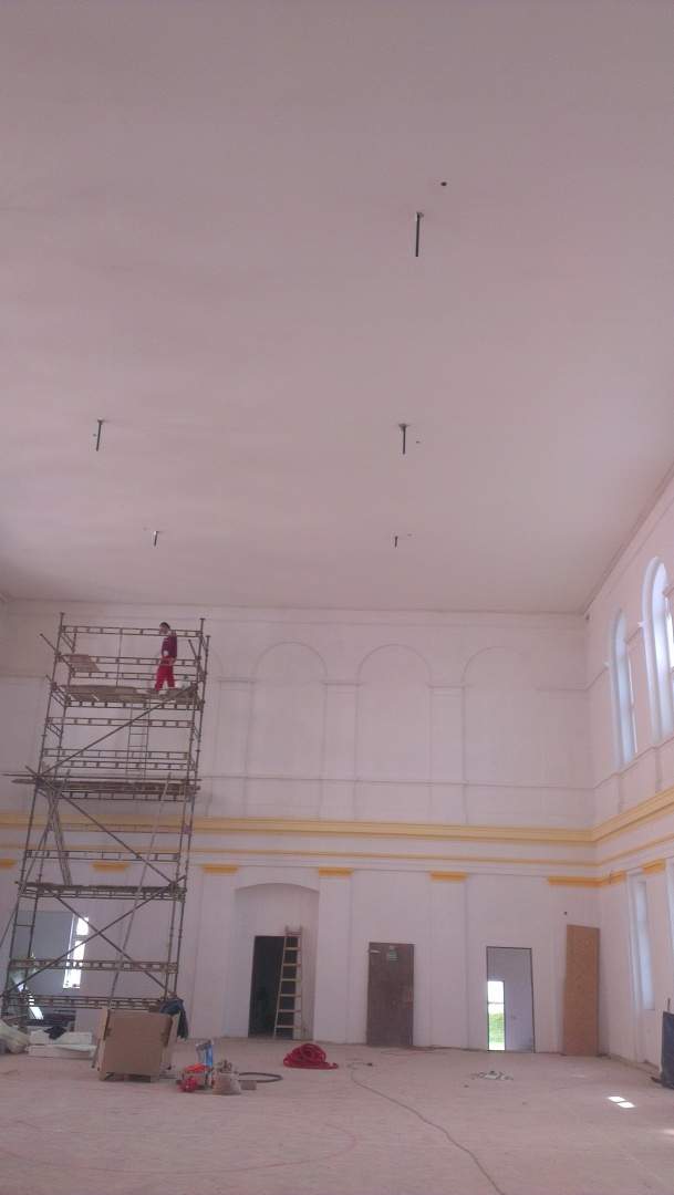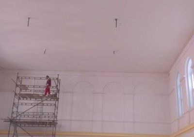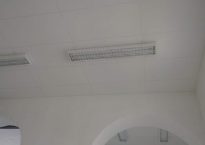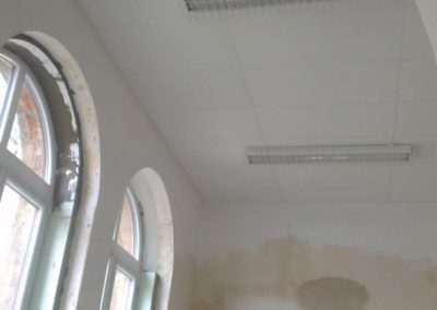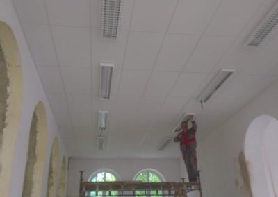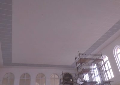 Byli jsme osloveni vyšším dodavatelem, který rekonstruoval ZŠ v Rumburku. Zadáním bylo dodat akustický podhled do dvou tělocvičen při dodržení akustické studie a předepsané doby dozvuku. Ve velké tělocvičně byl na stávajícím stropu namontován sádrokartonový podhled s minerální izolací a parotěsnou zábranou, oba dva prvky musely zůstat na svém místě. Naše práce tedy začaly demontáží, opatrně jsme demontovali sádrokartonový záklop, opravili parotěsnou folii a začali s montáží profesionálního akustického panelu ve statutu „širokopásmový akustický absorbér, třída pohltivosti A, koeficient pohltivosti aw=0,95“. Byl použit výrobek EUROCOUSTIC ACOUSTISHOCK, jedná se o akustický panel vhodný do tělocvičen, kde se provozují míčové hry. Tento panel je opatřen protinárazovou roznášecí mřížkou. Celková konstrukce podhledu byla dále opatřena protinárazovým systémem tak, aby nedocházelo k vyražení kazety z rastru podhledu. Architekt si vytvořil vlastní kladečský list s rozložením kazet včetně barevných variant. Po realizaci proběhlo závěrečné akustické měření, které prokázalo, že je vše tak, jak bylo vypočítáno v teoretické akustické studii.
