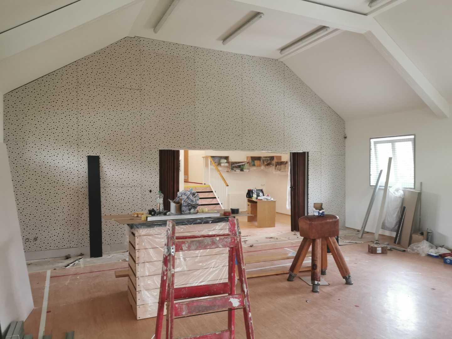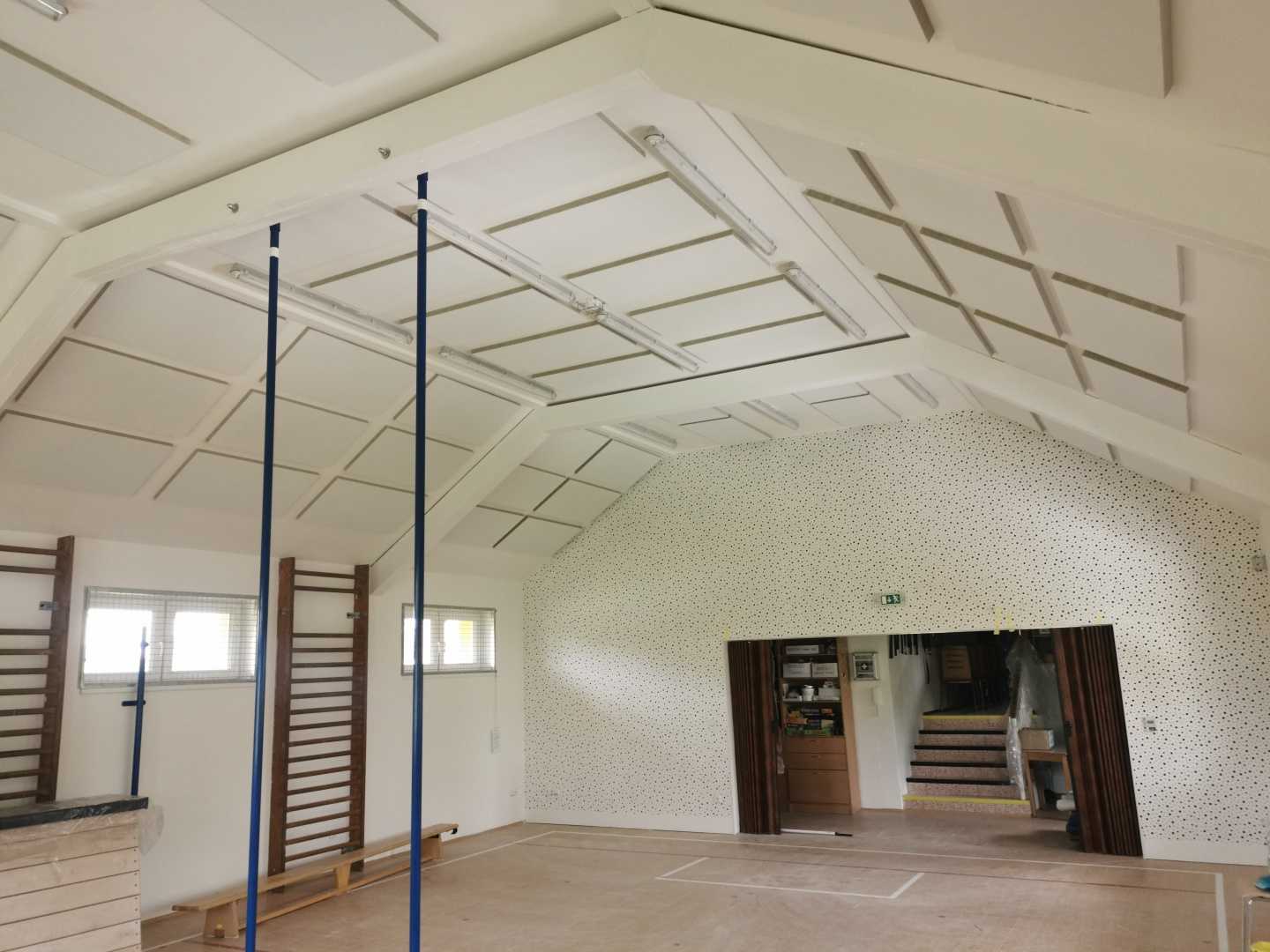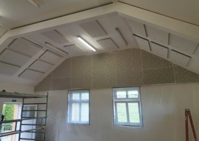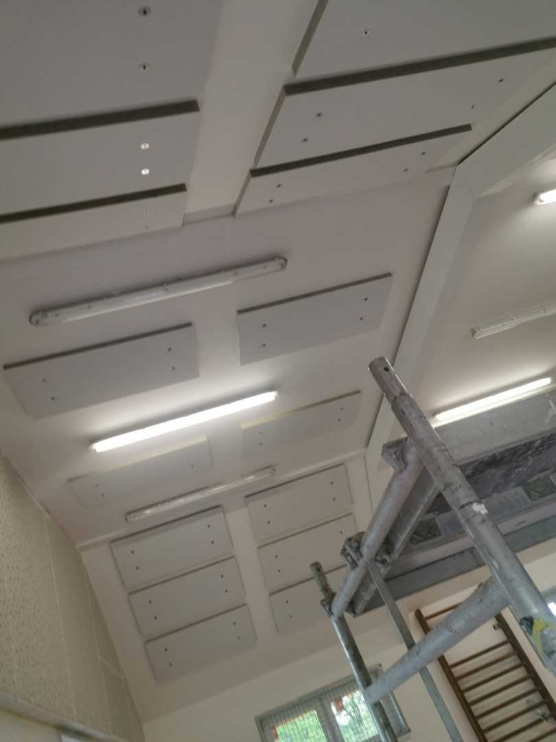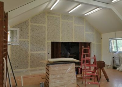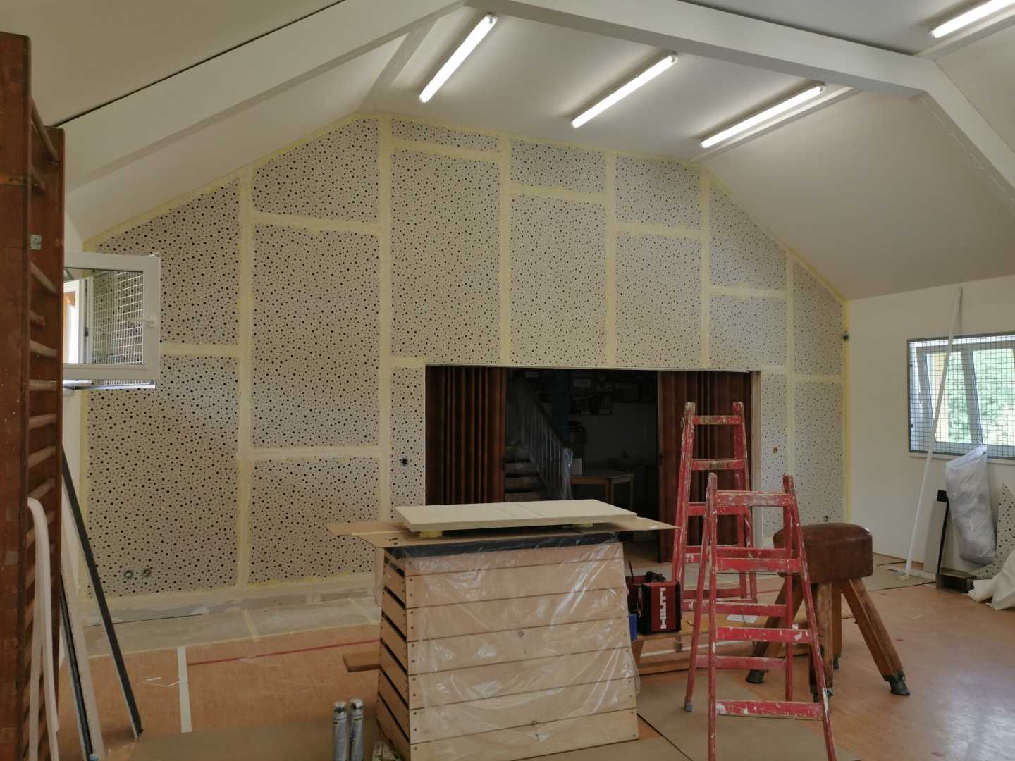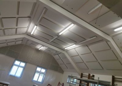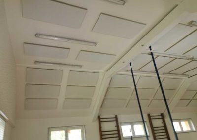Byla navržena stěna Cleaneo do dvou pozic a na stávající SDK strop a šikminy nalepený akustický panel s protinárazovou úpravou, dohromady 60KS. Doba realizace 3dny. Výsledná doba dozvuku je 1sek.
