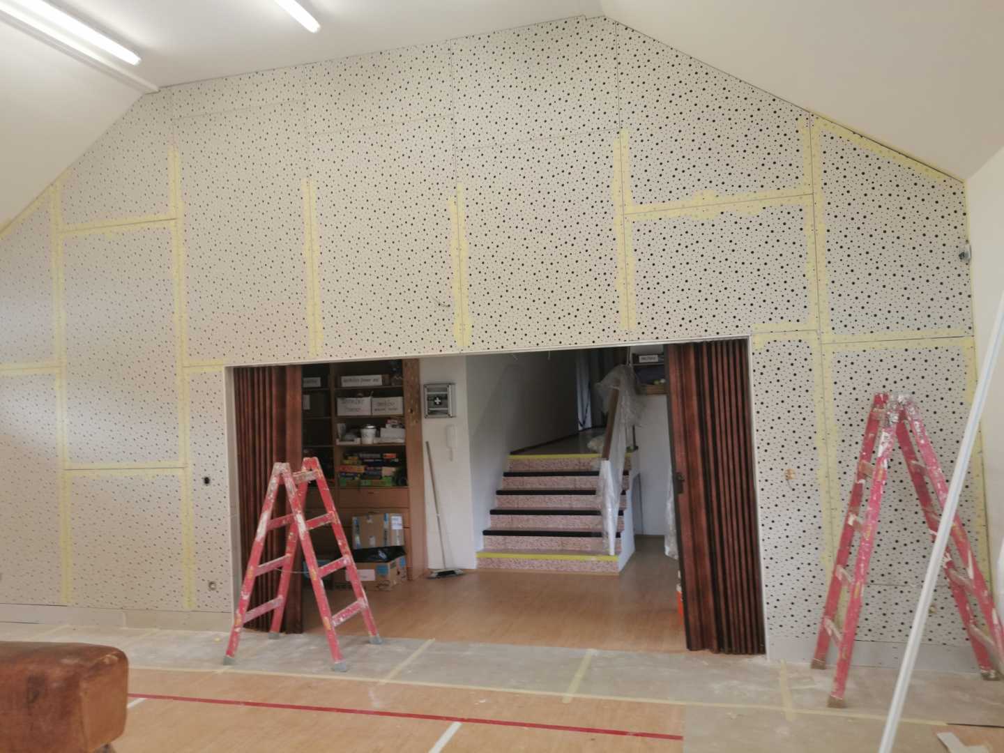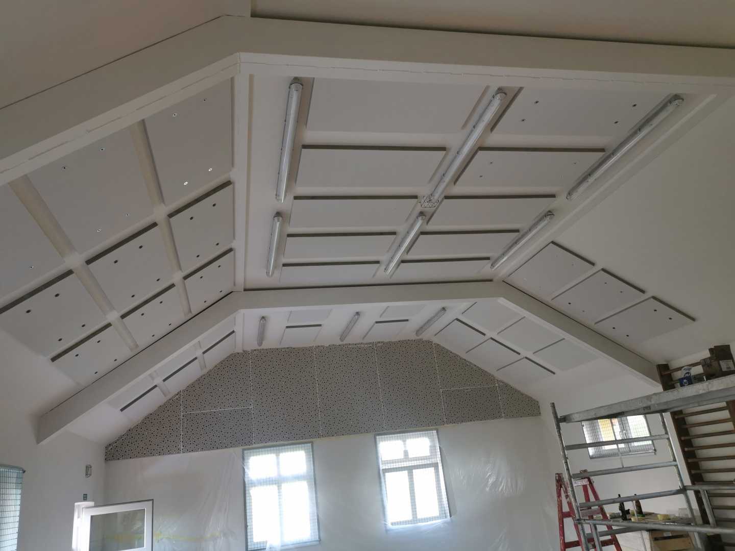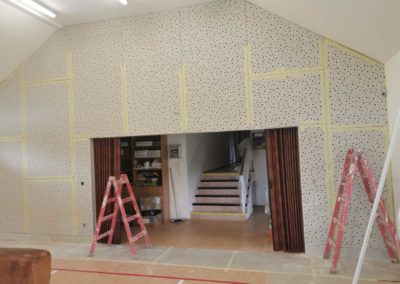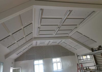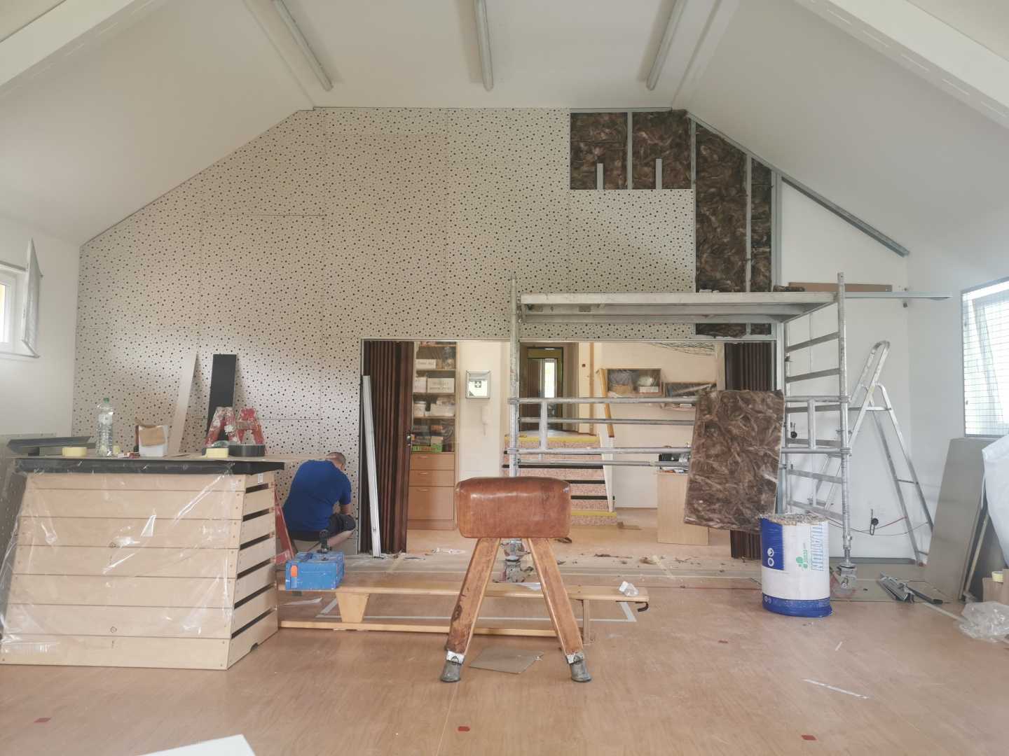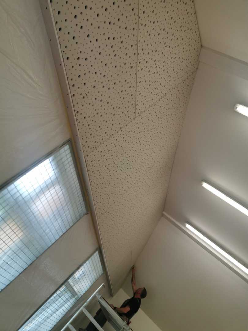 Byla navržena stěna Cleaneo do dvou pozic a na stávající SDK strop a šikminy nalepený akustický panel s protinárazovou úpravou, dohromady 60KS. Doba realizace 3dny. Výsledná doba dozvuku je 1sek.