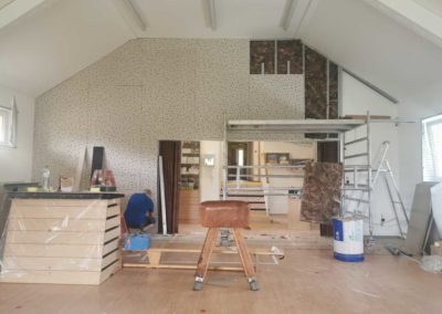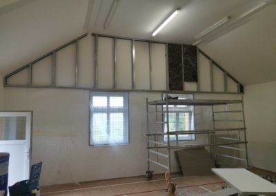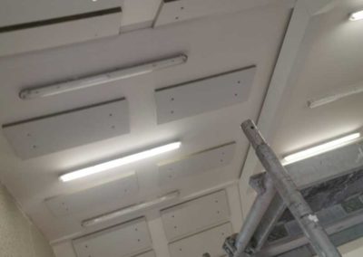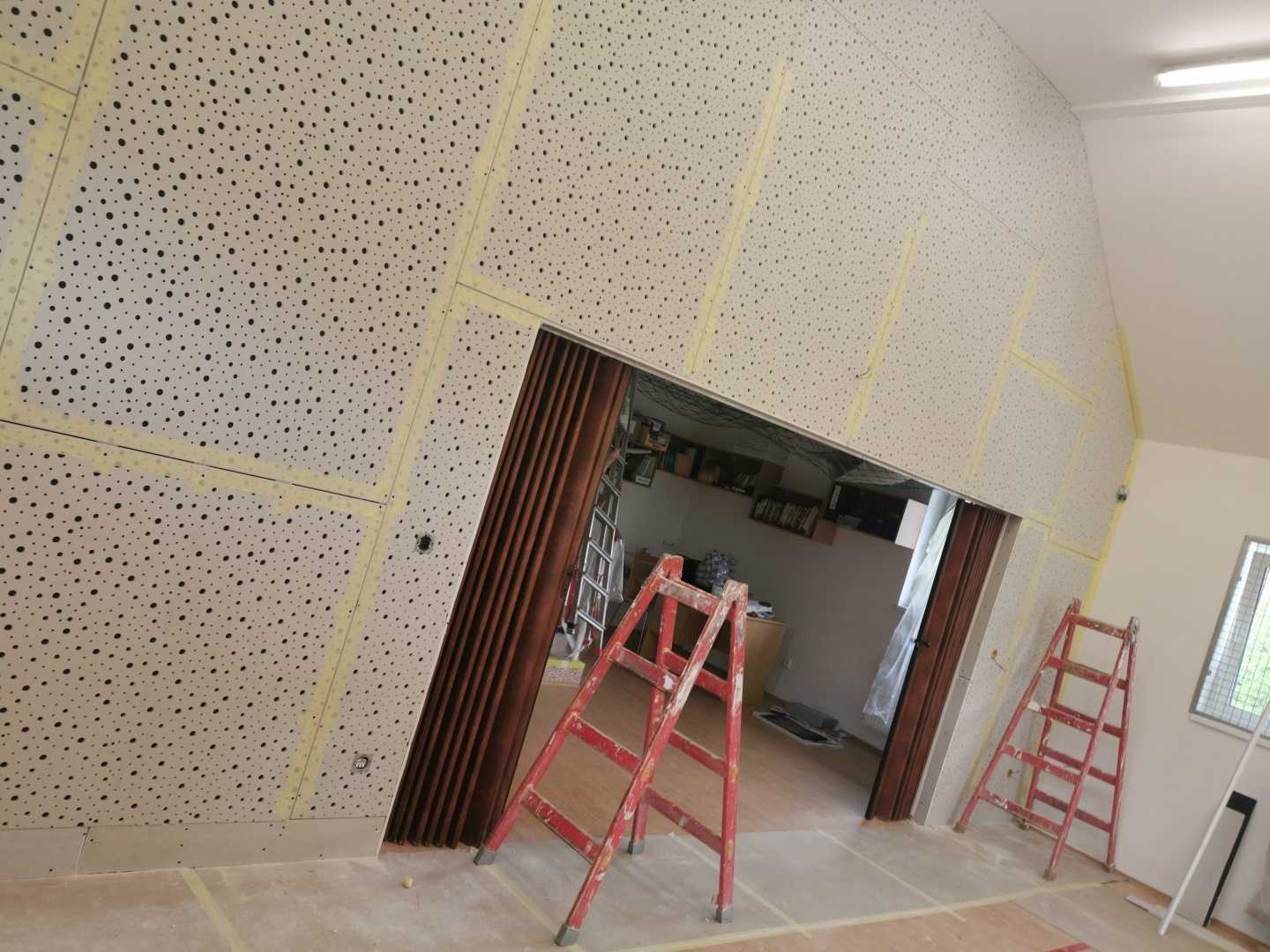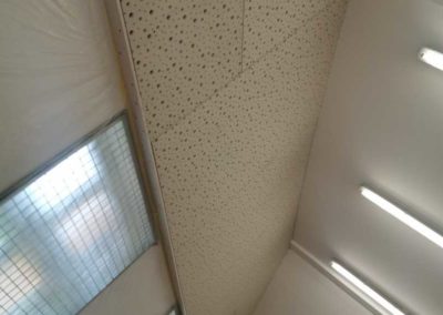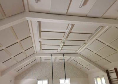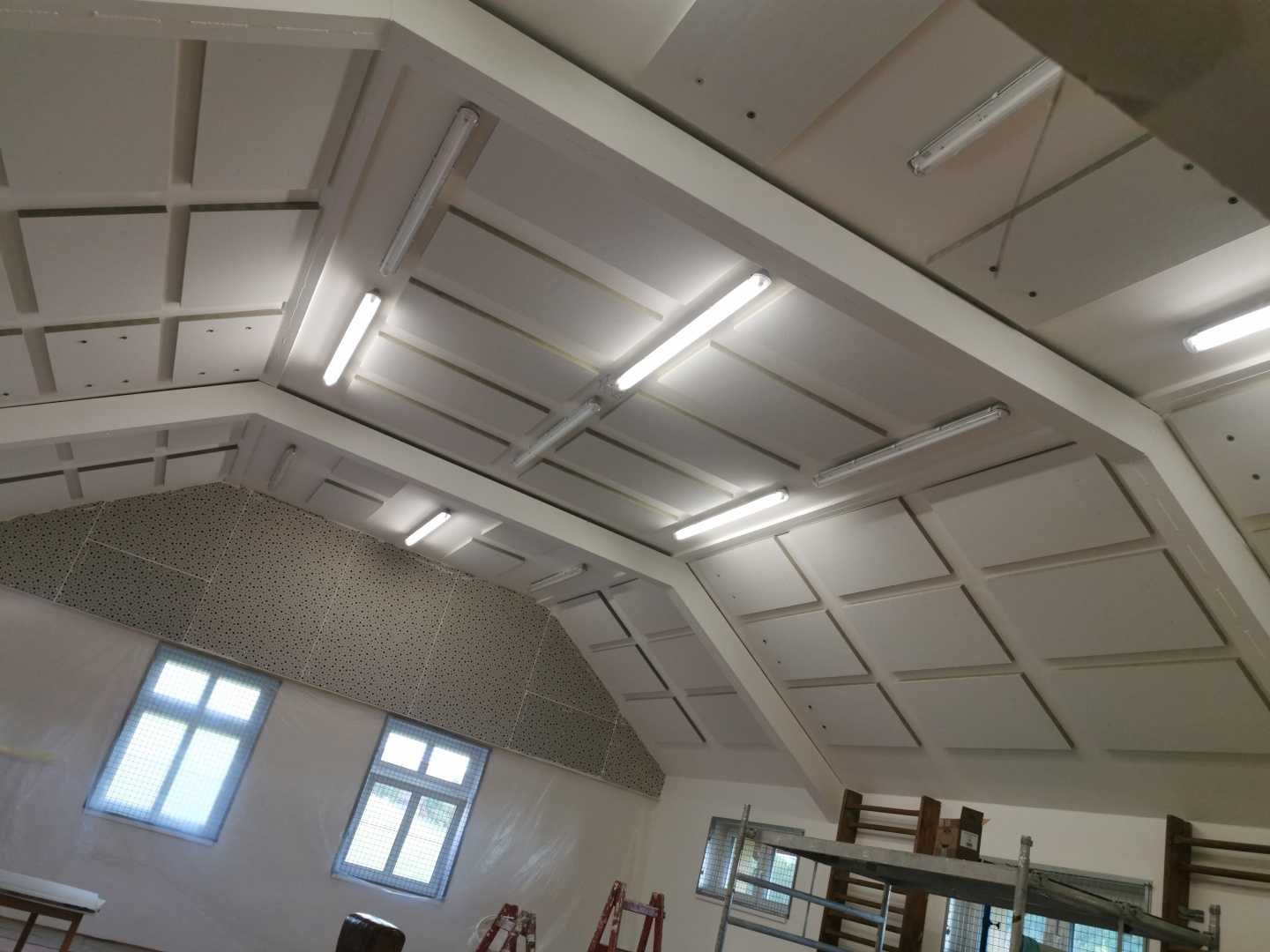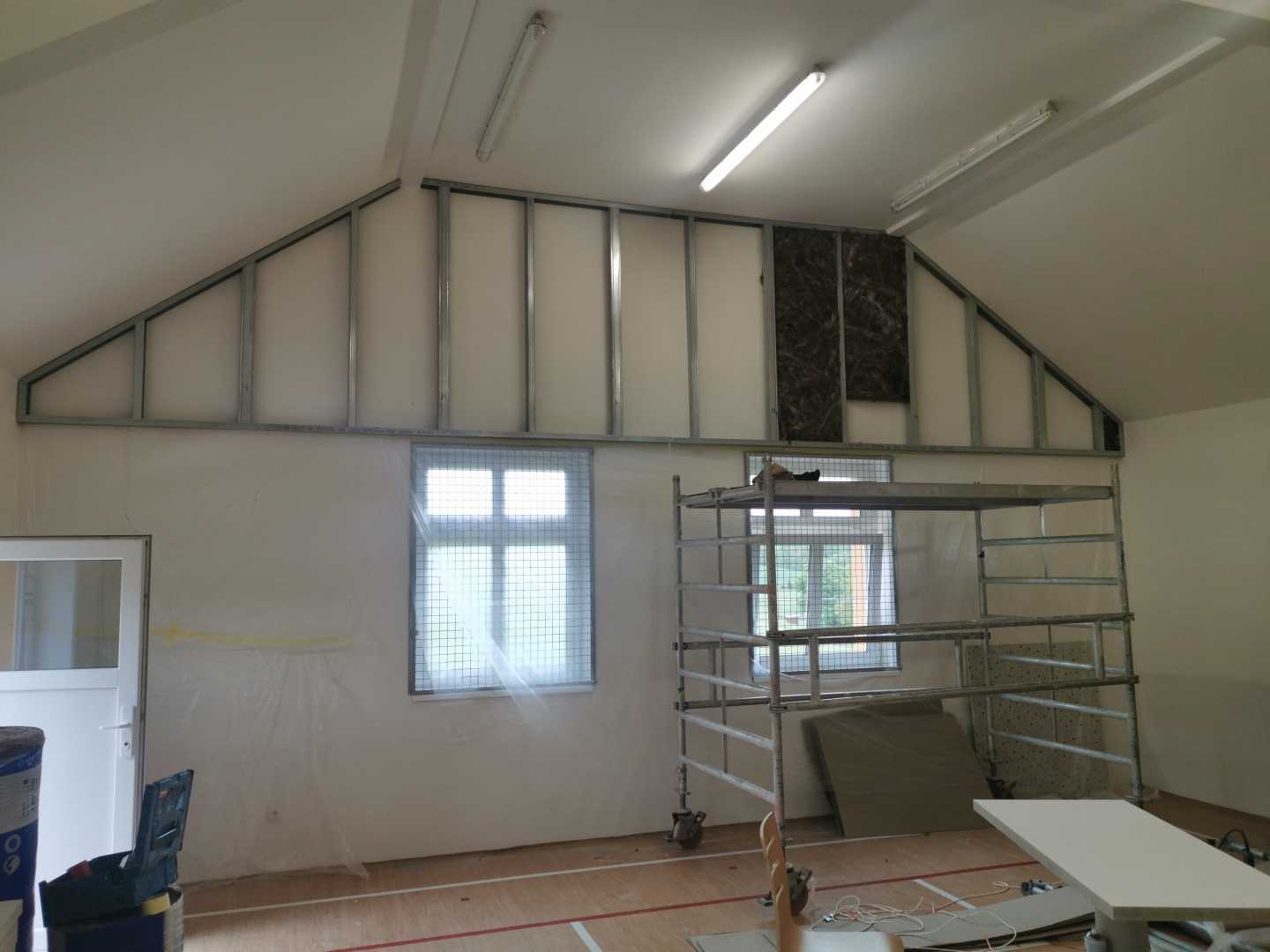 Byla navržena stěna Cleaneo do dvou pozic a na stávající SDK strop a šikminy nalepený akustický panel s protinárazovou úpravou, dohromady 60KS. Doba realizace 3dny. Výsledná doba dozvuku je 1sek.