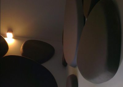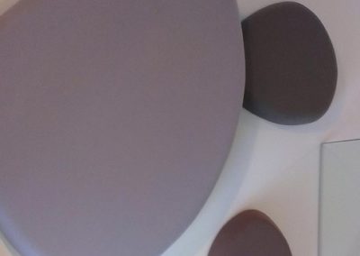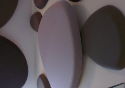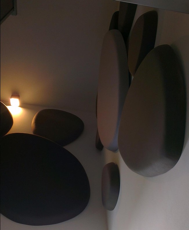 - Použité materiály: Designové akustické panely vyrobené na zakázku – akustické kameny