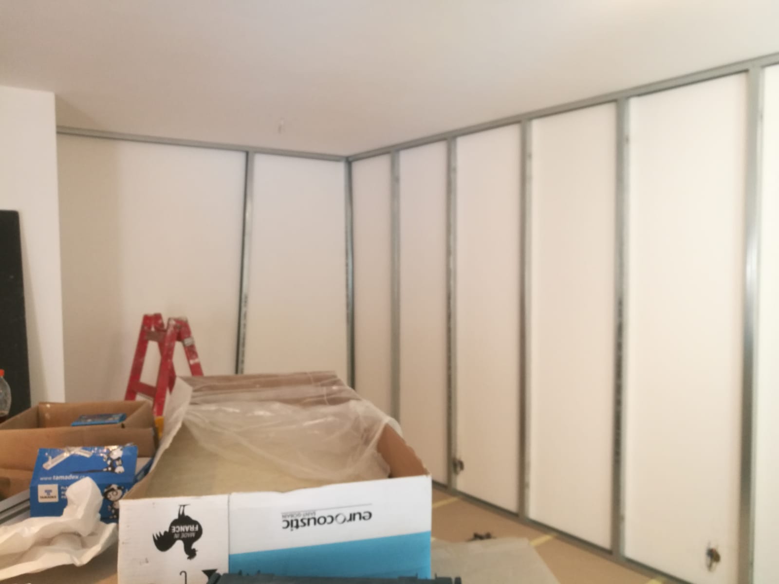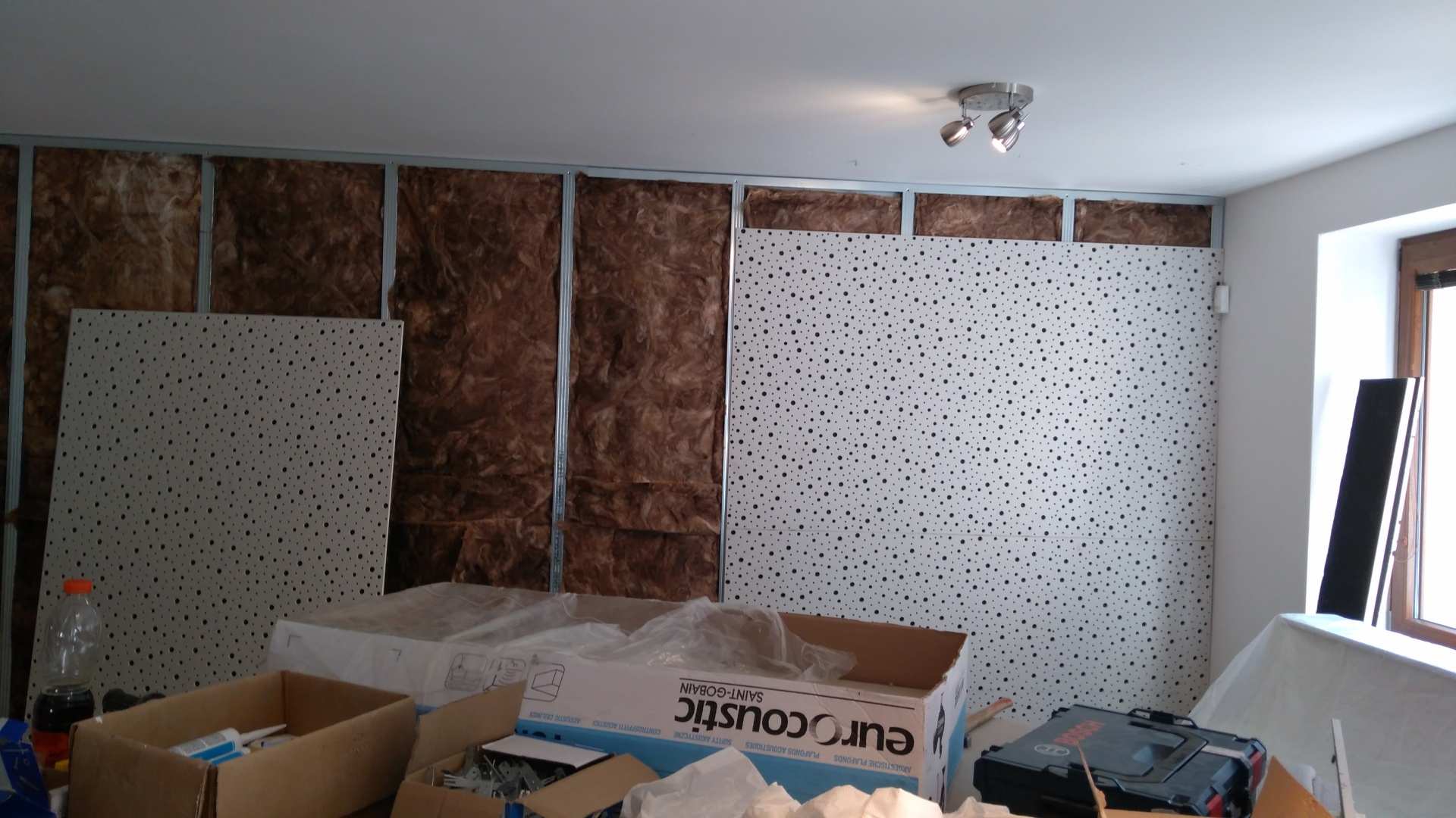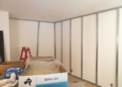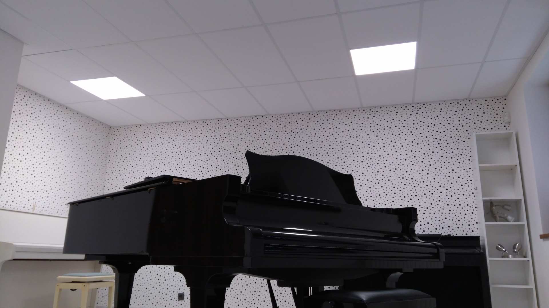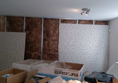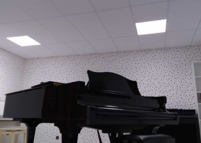 Kompletní dodávka akusticky pohltivých ploch pro domácí zkušebnu hry na klavír, montáž stěn Knauf Cleaneo a akustického rastrového podhledu EUROCOUSTIC a modulových svítidel ve spektru denního světla. Po úpravě vykazoval prostor dobu dozvuku kolem hodnoty 1,2s.