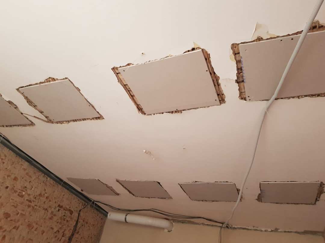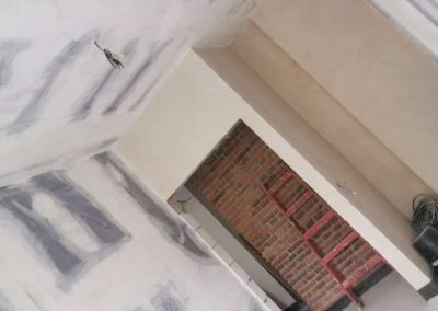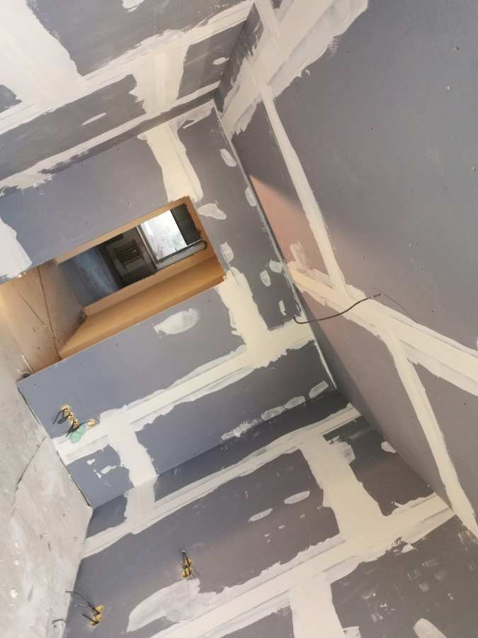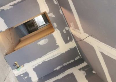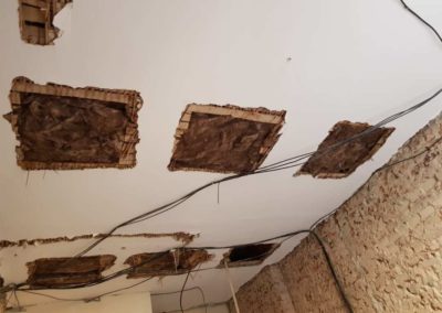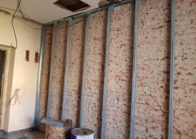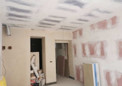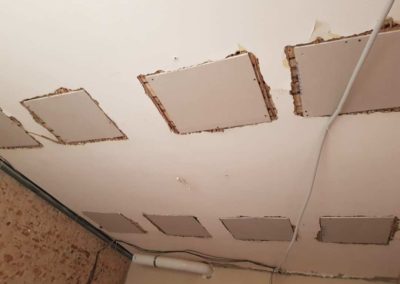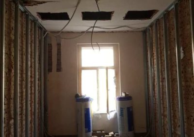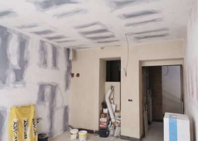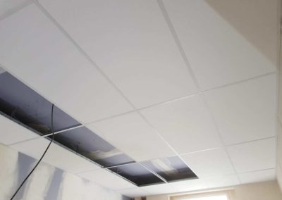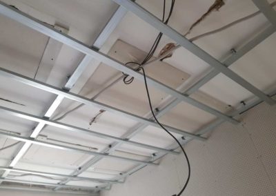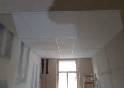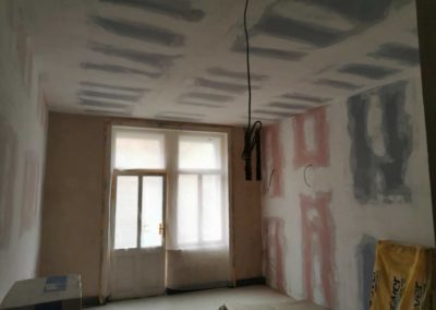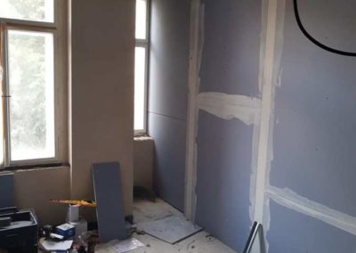 V celé ploše stropu byly udělány otvory a veškeré dutiny stropu nad podbitím byly vyplněny 20cm akustickou izolací, otvory následně zavřeny SDK deskou. Pod stávající stropy byly dodány akusticky neprůzvučné podhledy povětšinou s deskou Diamant. Stěny byly také ošetřeny, kritické tenké pak s desku WOLF, klasické s dvojím opláštěním Diamantem. V prostoru pracovny pak byla upravena doba dozvuku pohltivou předsazenou stěnou a akustickým podhledem.