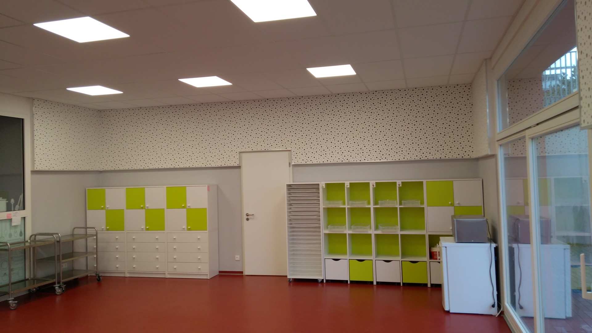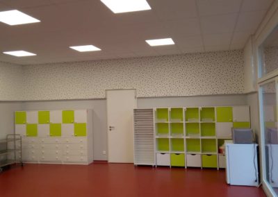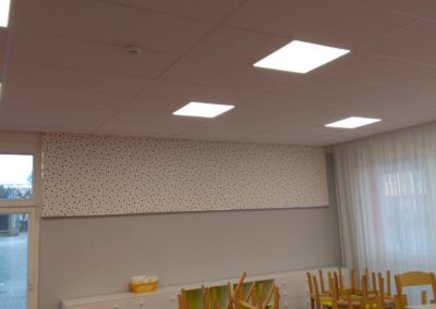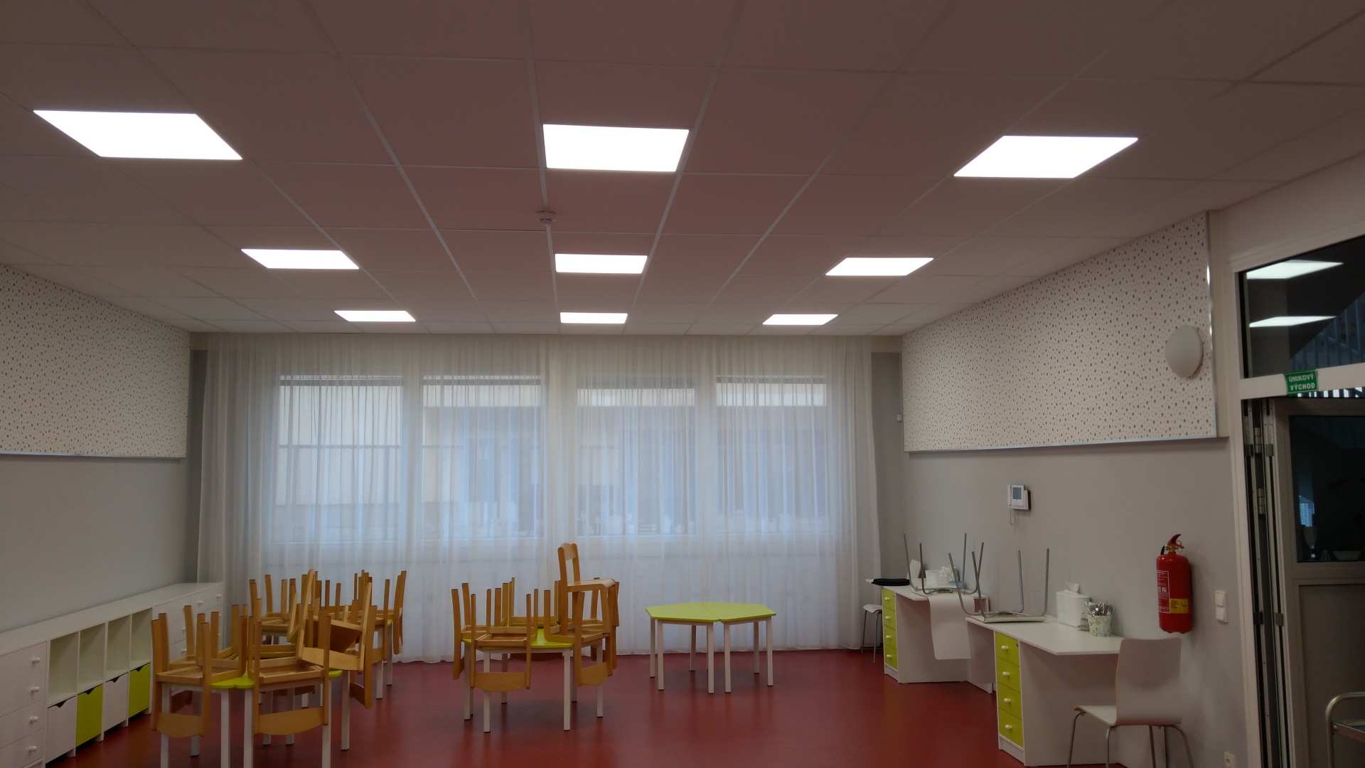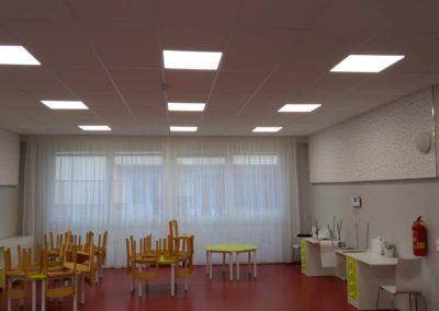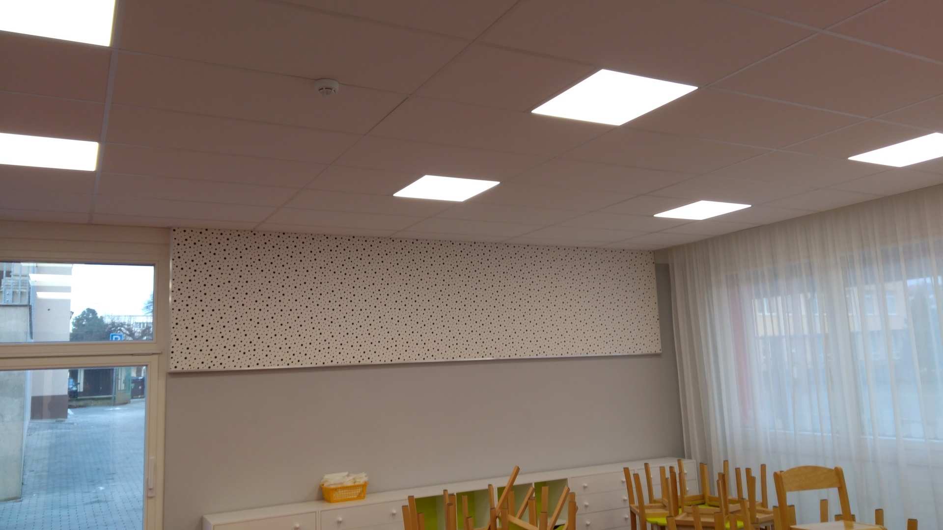 montáž akustických rastrových, minerálních podhledů včetně dodávky rastrových světel se spektrem denního světla, montáž akusticky pohltivých ploch na stěny za pomoci desek Knauf Cleaneo k potlačení odrážení zvuků a vzniku ozvěny v prostoru jídelny a hracích místností ve školce.