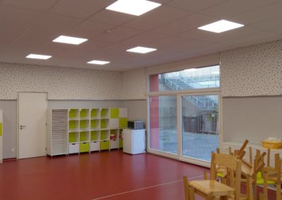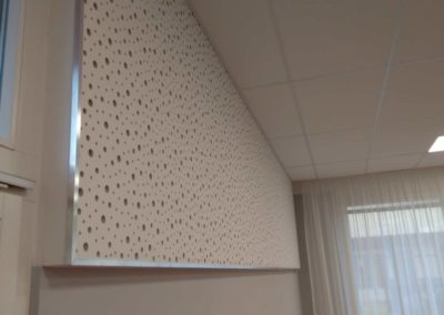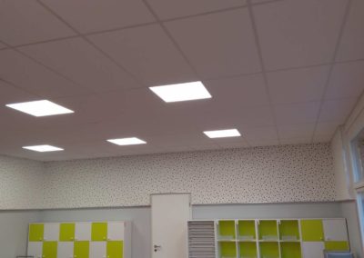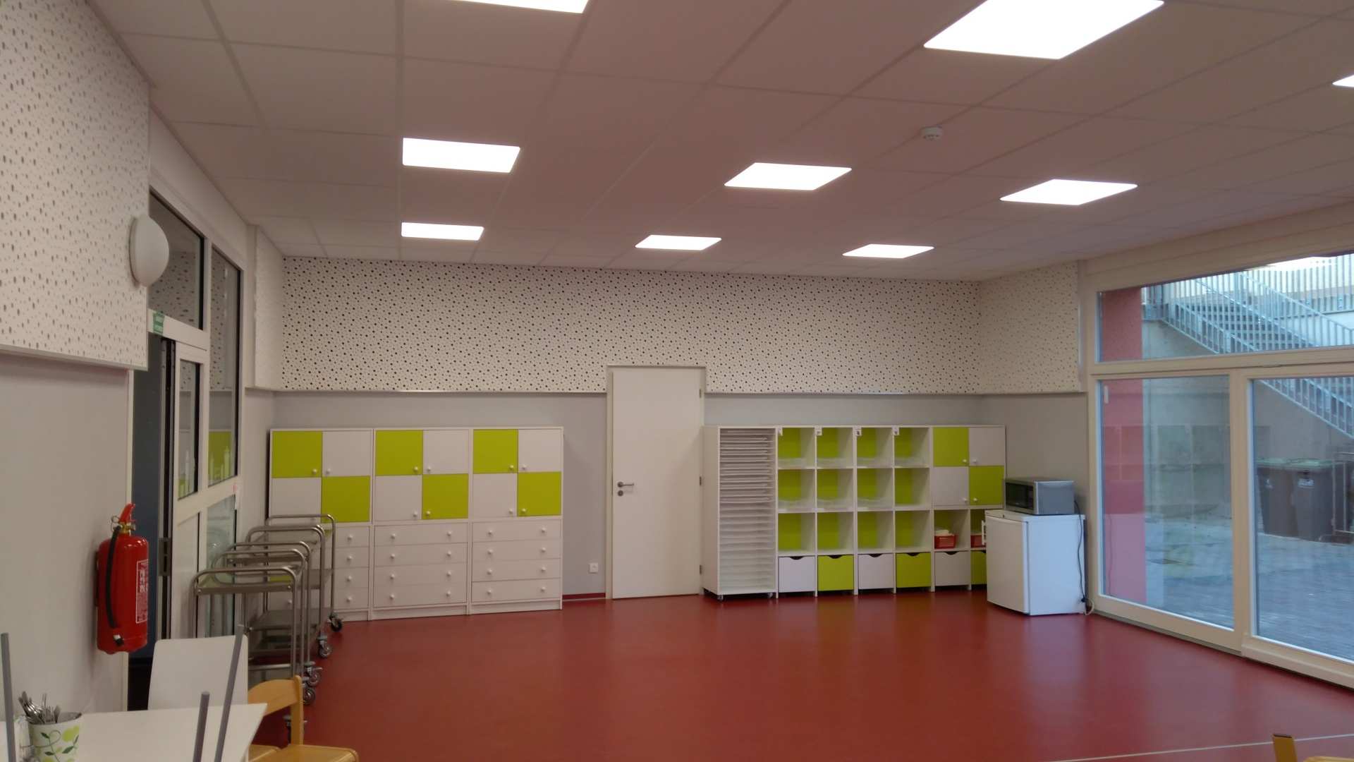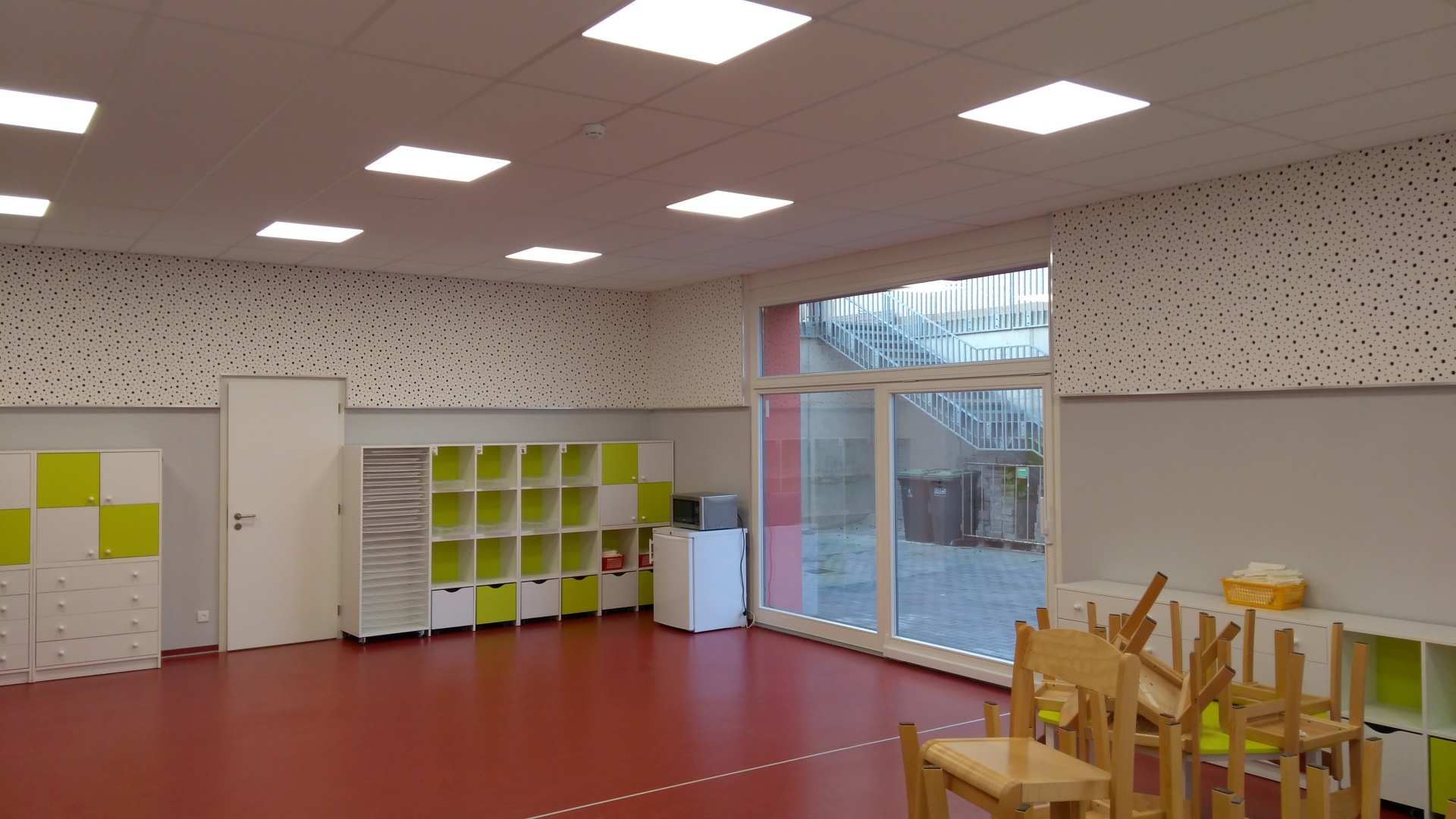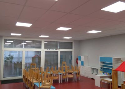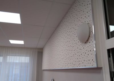 montáž akustických rastrových, minerálních podhledů včetně dodávky rastrových světel se spektrem denního světla, montáž akusticky pohltivých ploch na stěny za pomoci desek Knauf Cleaneo k potlačení odrážení zvuků a vzniku ozvěny v prostoru jídelny a hracích místností ve školce.