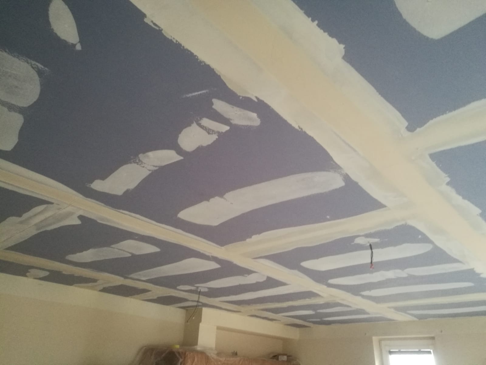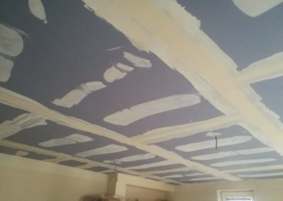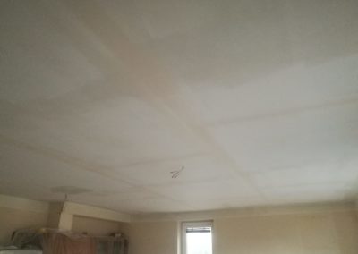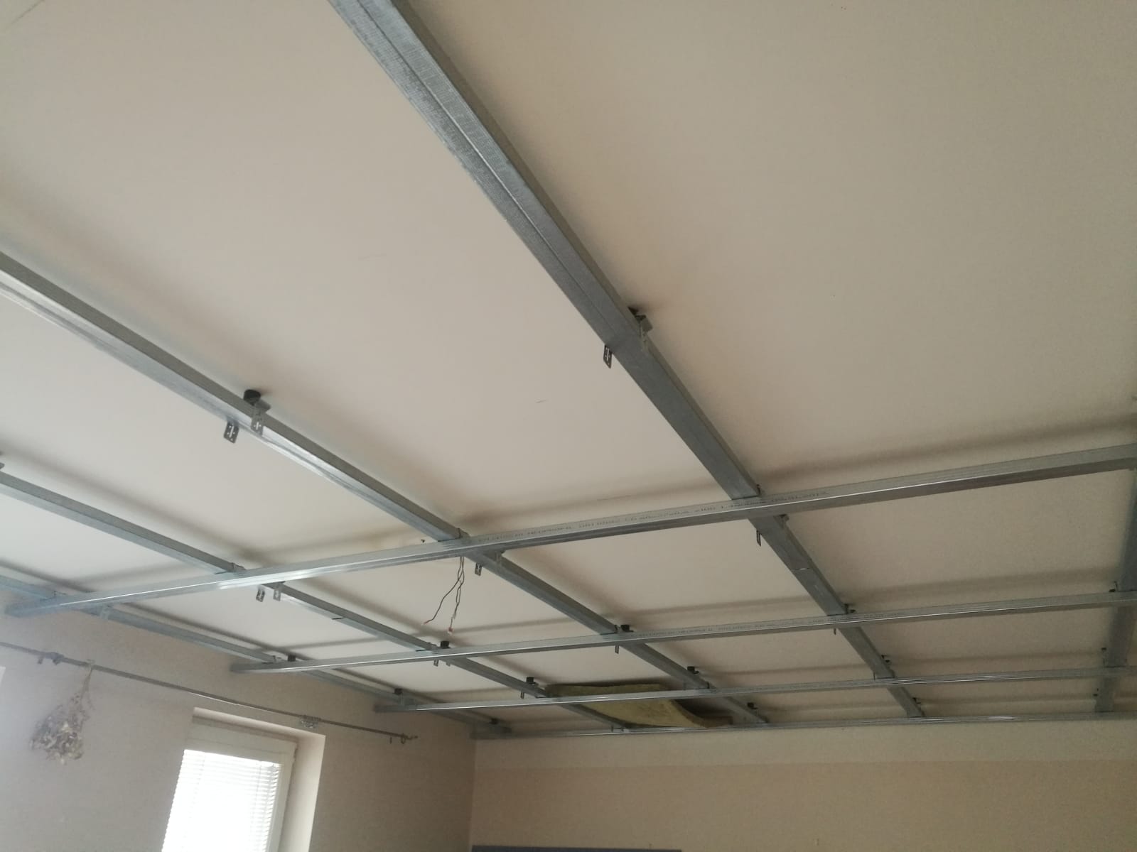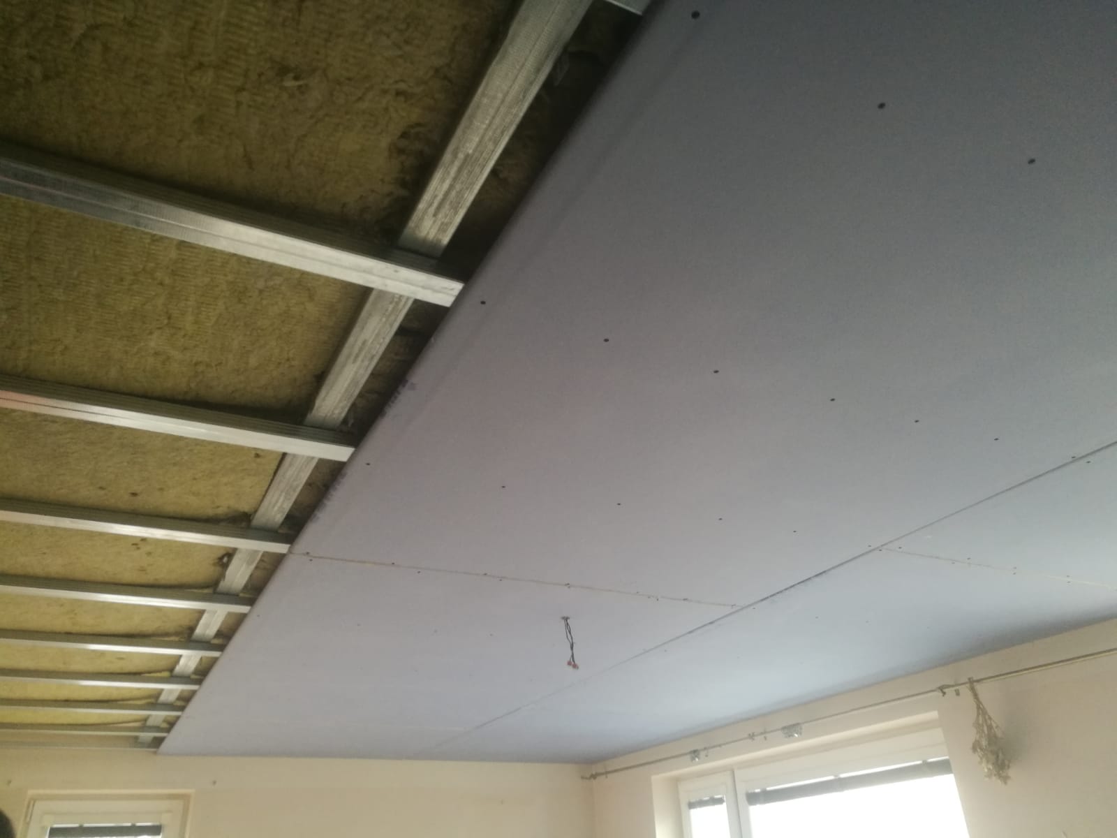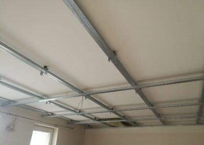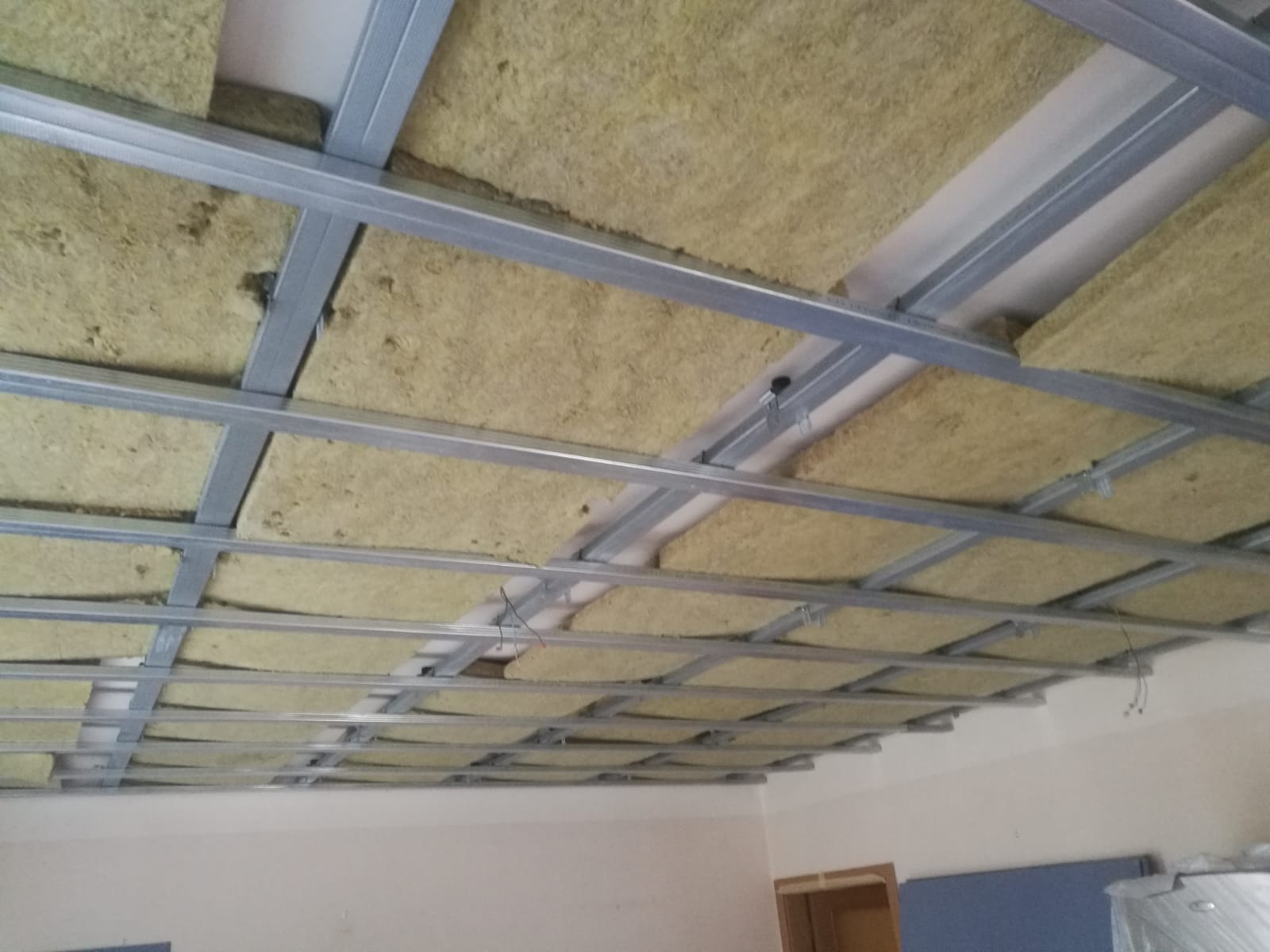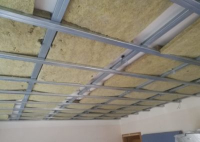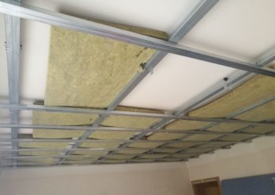 Bylo zde slyšitelné dupání a veškeré zvuky šířící se konstrukcí. Navržená skladba silentblokové pružné uchycení konstrukce, akustická izolace 4cm, snížení podhledu o 13cm, záklop deskou Diamant.