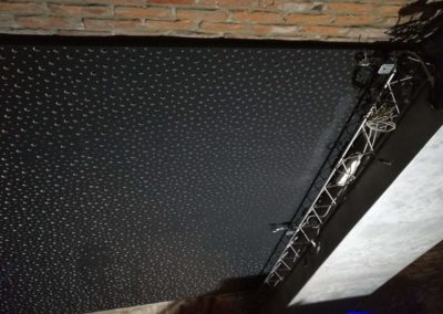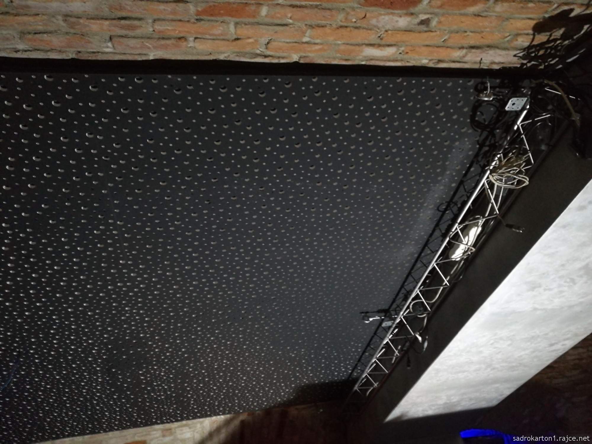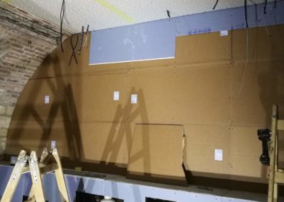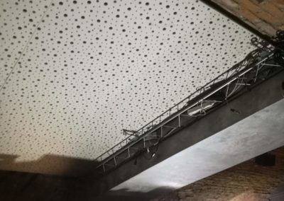 montáž neprůzvučných podhledů s deskou WOLF TRI 15, desek DIAMANT a podvěšeného dalšího akustického zvuk pohlcujícího podhledu do prostoru klenbového stropu, odhlučnění vzduchotechniky a potrubí, kterým pronikal hluk do obytných částí hotelu nad prostorem diskotéky.