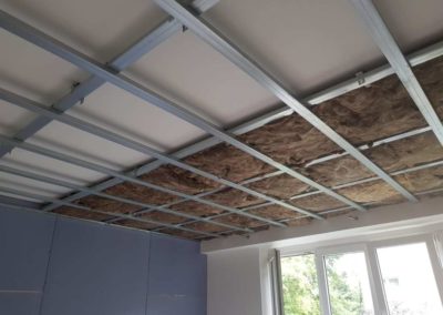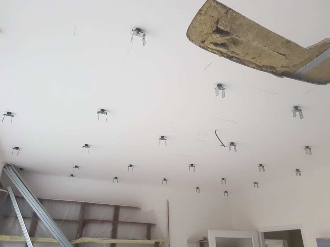 Byli provedeny sondy a zjistili jsme, že stávající konstrukce podhledu nebyla montována na přerušovačích vibrací, izolace v podhledu byla dostačující a záklop byl proveden základní akustickou deskou. Nic méně jsem uznal, že podhled nějakou tu funkci plnit bude. Stávající strop byl trámový, tak nás s kolegou napadlo, že bychom detekovali nosné trámy a přes stávající sádrokartonový podhled prošroubovali silentblokové závěsy právě do nosných trámů. Montáž se povedla, zákazník dostal slevu, protože se nemusel demontovat sádrokartonový podhled a my jsme si vyzkoušeli, že pokud je dostatečný prostor tak lze podvěsit pod starý špatně izolační podhled ještě jeden.