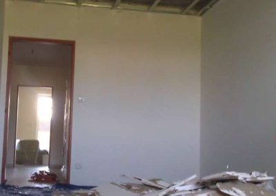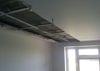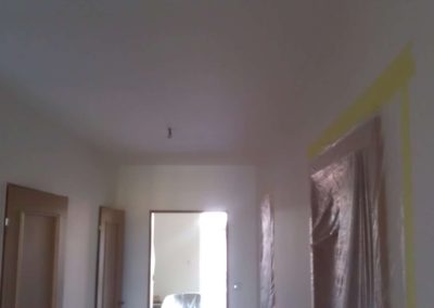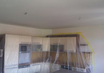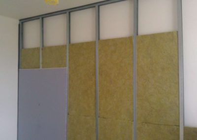 Návrh opatření: demontáž stávajících podhledů cca 75m2 v ložnici, pokojích, jídelně a chodbě, začištění a namontování akustických neprůzvučných podhledů. Stávající závěsy podhledu nebylo možné použít, protože by energii (dupání, cvakání..) přenesly do nového podhledu, proto byly použity silentblokové závěsy, které vibrace nepřenesou. Dále byla navrhnuta do podhledu akusticky pohltivá minerální izolace, která vyplnila dutinu, svěšení podhledu od stávajícího stropu 13,2cm.