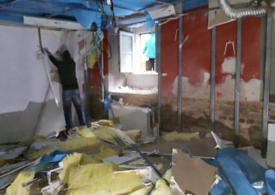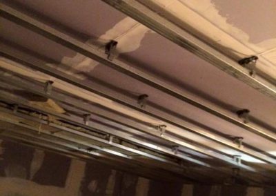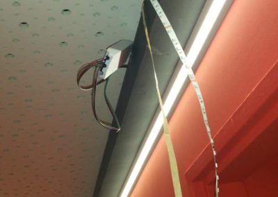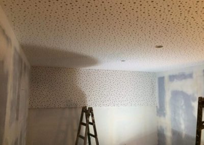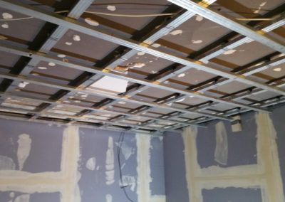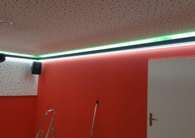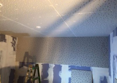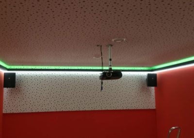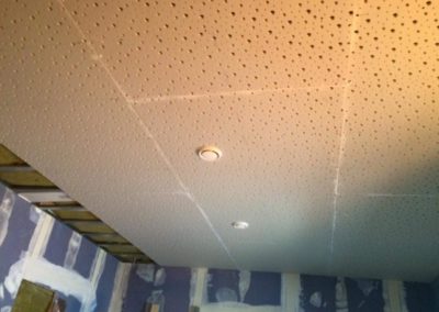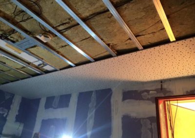 Tato zakázka byla tak trochu výzva. Nejprve jsme v místnosti demontovali všechny sádrokartonové obklady stěn a podhled stropu. Na stěny dodali novou, složitou akusticky neprůzvučnou skladbu v 15cm šířce skládající se ze dvou absorbérů, dvou nezávislých konstrukcí a třech neprůzvučných desek Lasound. Na strop byl dodán složitý kombinovaný podhled, tento podhled měl na sobě nezávislé tři konstrukce, tři akustické izolace, dva neprůzvučné deskové materiály a poslední vrstva byla pohltivá – Knauf Cleaneo. Celkové snížení něco málo nad 20 cm. Vchod byl upraven dalším zádveřím a přidáním těžkých celodřevěných dveří.