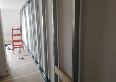 Ocelová konstrukce na gumových obvodových pásech, akustická izolace Decibel, 1x deska Diamant a 1x deska Knauf Silent. Celková šíře 12cm.