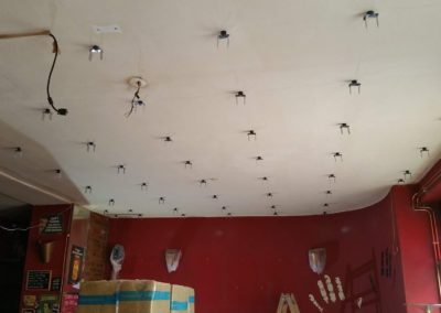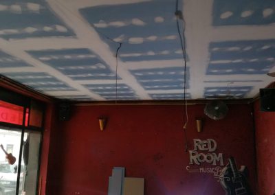 V tomto případě hluk pronikal do vyššího patra nad barem. Byl dodán neprůzvučný podhled na silentblokových závěsech, vloženou akustickou izolací a neprůzvučnou deskou. Realizací nedošlo k optimálnímu vyřešení a zákazníkovi byla navržena další opatření, která zamezí prostupu vibrací do konstrukce, zejména odkotvení pódia ze stěny, pružné uložení reprobeden, vysypání komínových řádů pískem. Zde bohužel pouze podhled k eliminování hluku nestačil, protože zde bylo hodně jiných akustických mostů.