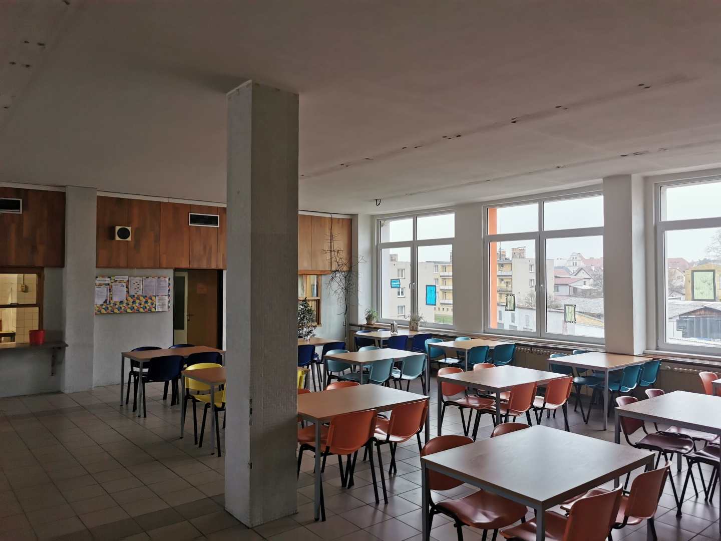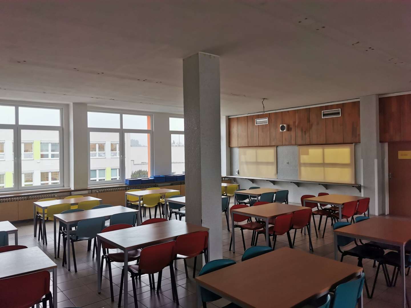Ve školní jídelně v Kaplici jsme čelili výzvě související s abnormálně dlouhou dobou dozvuku. Při první návštěvě bylo okamžitě patrné, že akustické podmínky zde nejsou příznivé, protože všechny povrchy v místnosti byly rovné a tvrdé. Sklo, dlažba, obklad a beton tvořily materiály, které odrážejí zvuk, což vedlo k obtížné komunikaci a nepříjemné akustice, typické pro podobné prostory.