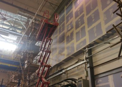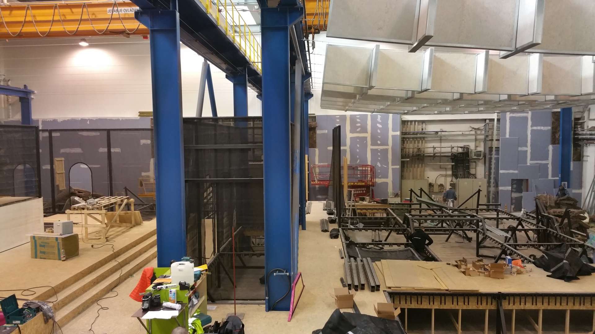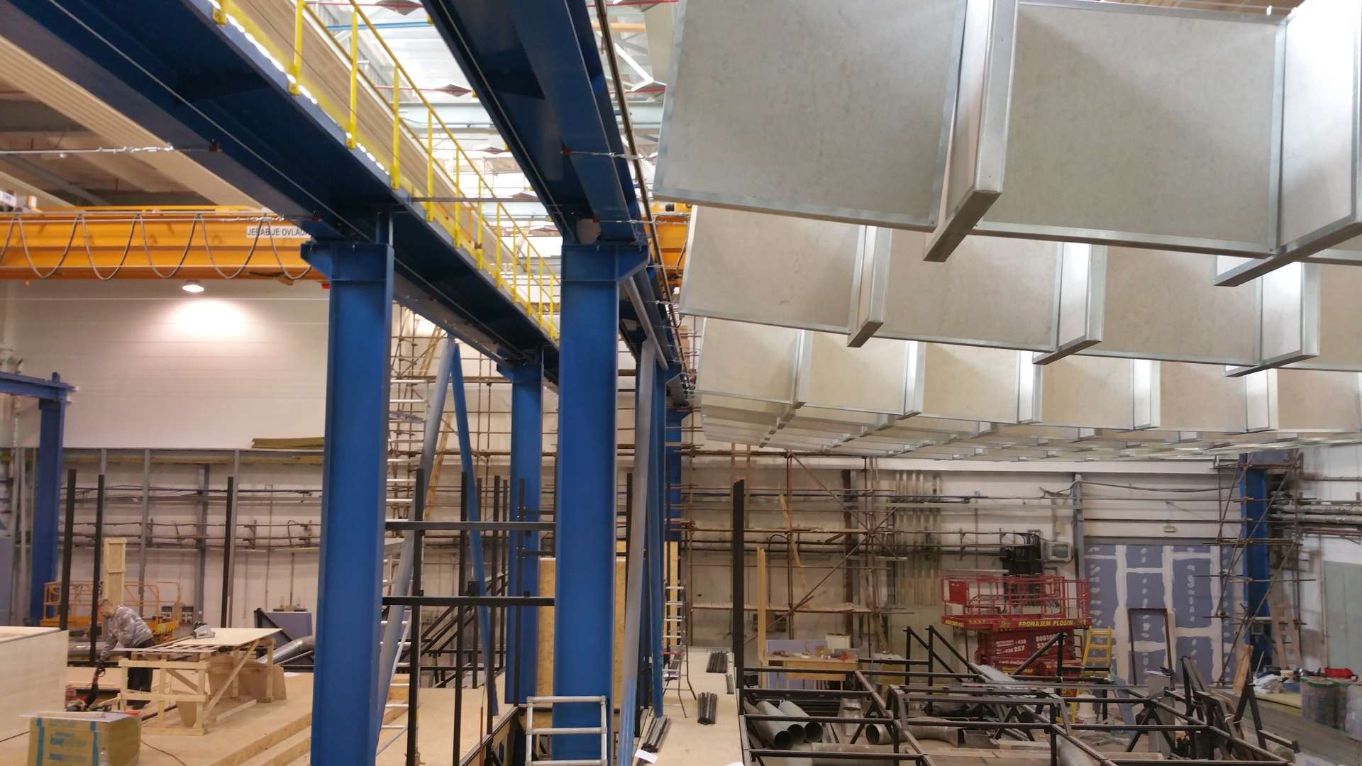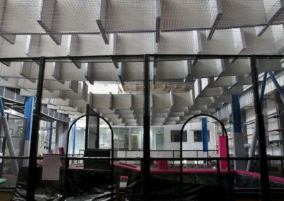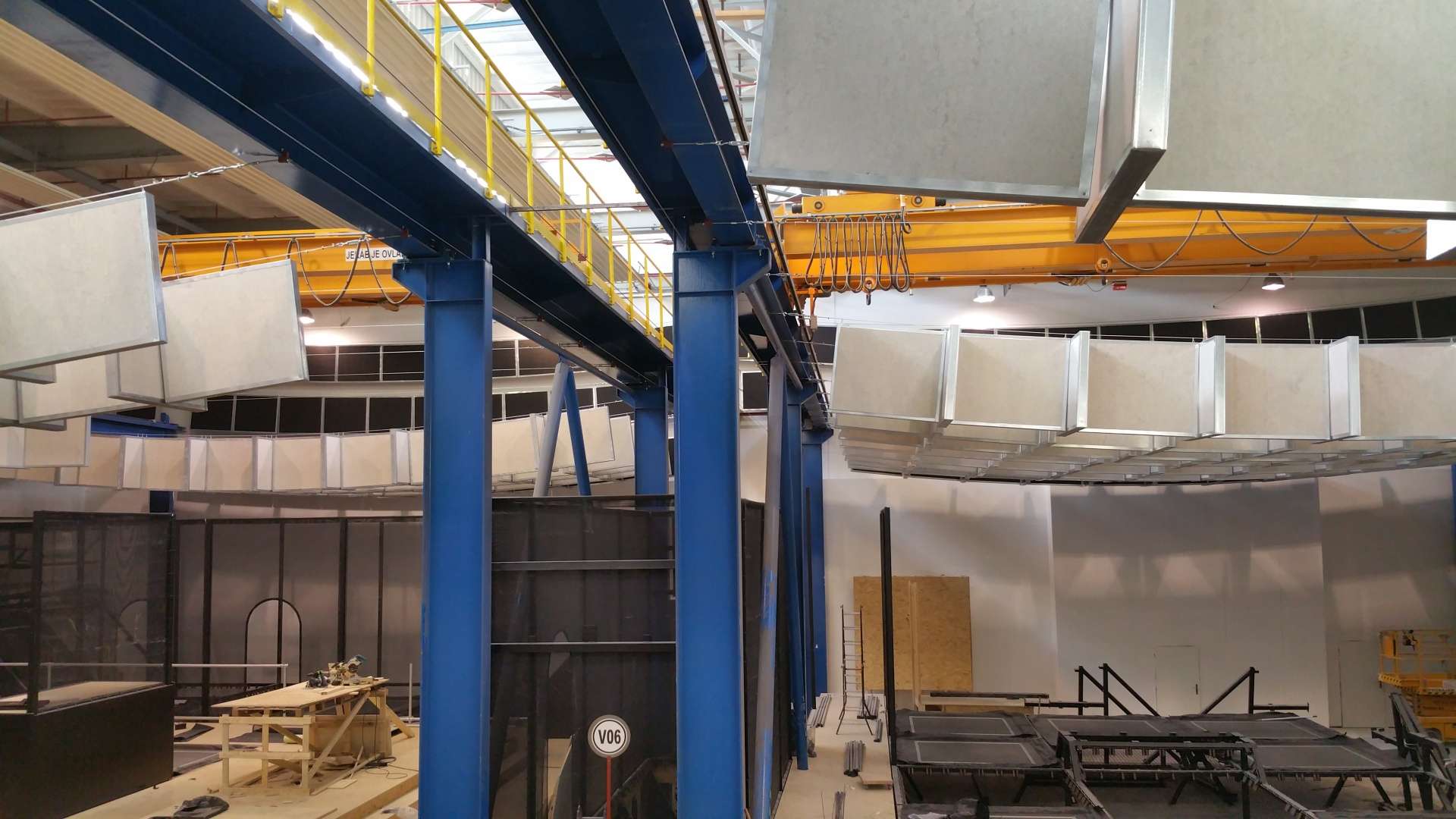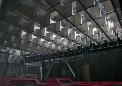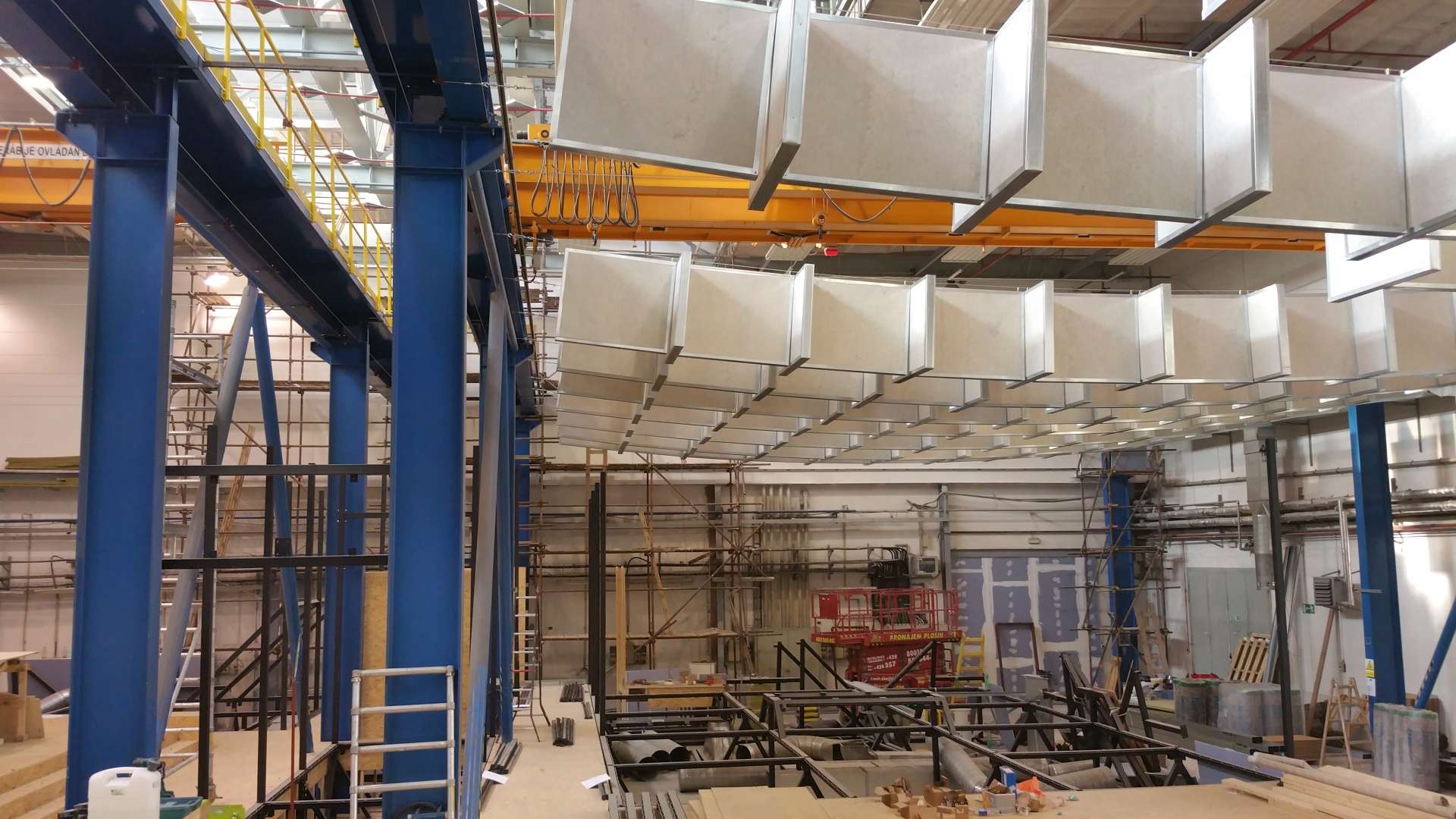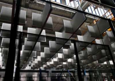 Dále bylo zásadní upravit dobu dozvuku. Původní stav se pohyboval kolem hodnoty 5sec, v takovém prostoru 1300m2 není jednoduché a hlavně levné změnit poměr odrazivých ploch v pohltivé tak, aby se doba dozvuku zásadně změnila. Proto jsme sestrojily akustický širokopásmový absorber s hodnotou pohltivosti aw1,09, vlastně jsme jich smontovali bezmála 1000 ks. Tento panel má aktivní plochu pohlcení více jak 2,2m2 a díky svému vertikálnímu umístění je ještě efektivnější. Doba dozvuku byla korigována na hodnotu 2 – 2,5sec. Věděli jsme, že do celého prostoru přijde dodat ještě několik tun textilií, koženek, molitanů, koberců a jiných pohltivých materiálů, které ještě zamezí zbylému odrážení zvuku.