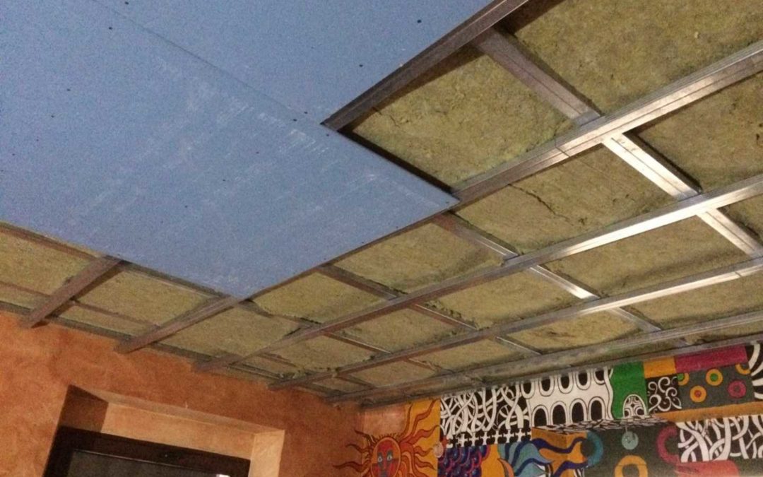 Neprůzvučný strop - restaurace Palmovka Neprůzvučný strop Montáž neprůzvučného stropu v prostorách restaurace za použití celoodpružené konstrukce na silentblokových závěsech s deskami LAFARGE –SINIAT. Malá klubová restaurace – bar při provozu bylo zřetelně slyšitelné...