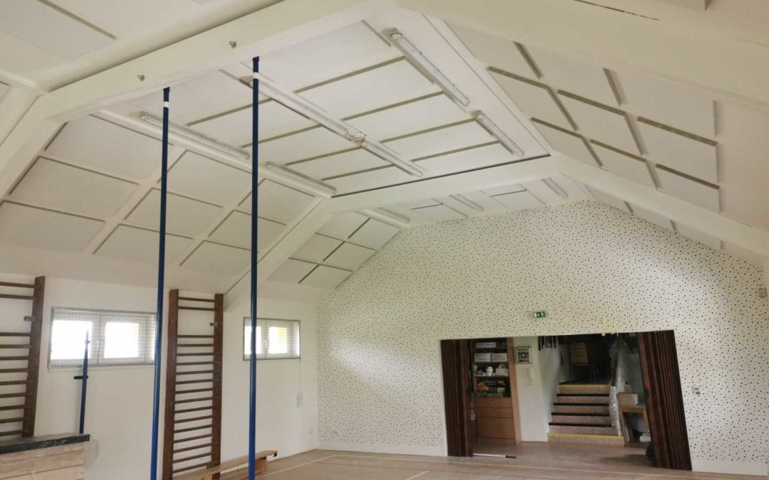 Akustika v tělocvičně ZŠ Mírová pod Kozákovem Malá tělocvična kolem 150m2, díky šikminám a komplet tvrdým a rovným povrchům zde byla doba dozvuku nad hodnotou 8sek.Byla navržena stěna Cleaneo do dvou pozic a na stávající SDK strop a šikminy nalepený akustický panel...